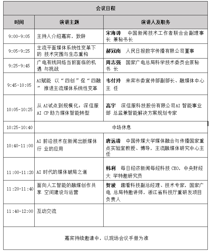 應(yīng)第三十二屆北京國(guó)際廣播電影電視展覽會(huì) (BIRTV2025) 組委會(huì)邀請(qǐng),中國(guó)新聞技術(shù)工作者聯(lián)合會(huì)將在展覽會(huì)期間舉辦 “AI賦能推動(dòng)新聞出版媒體行業(yè)發(fā)展”技術(shù)交流會(huì)。交流會(huì)將邀請(qǐng)人工智能領(lǐng)域的專家、學(xué)者和會(huì)員單位代表進(jìn)行研討和交流,參會(huì)免會(huì)議費(fèi)。